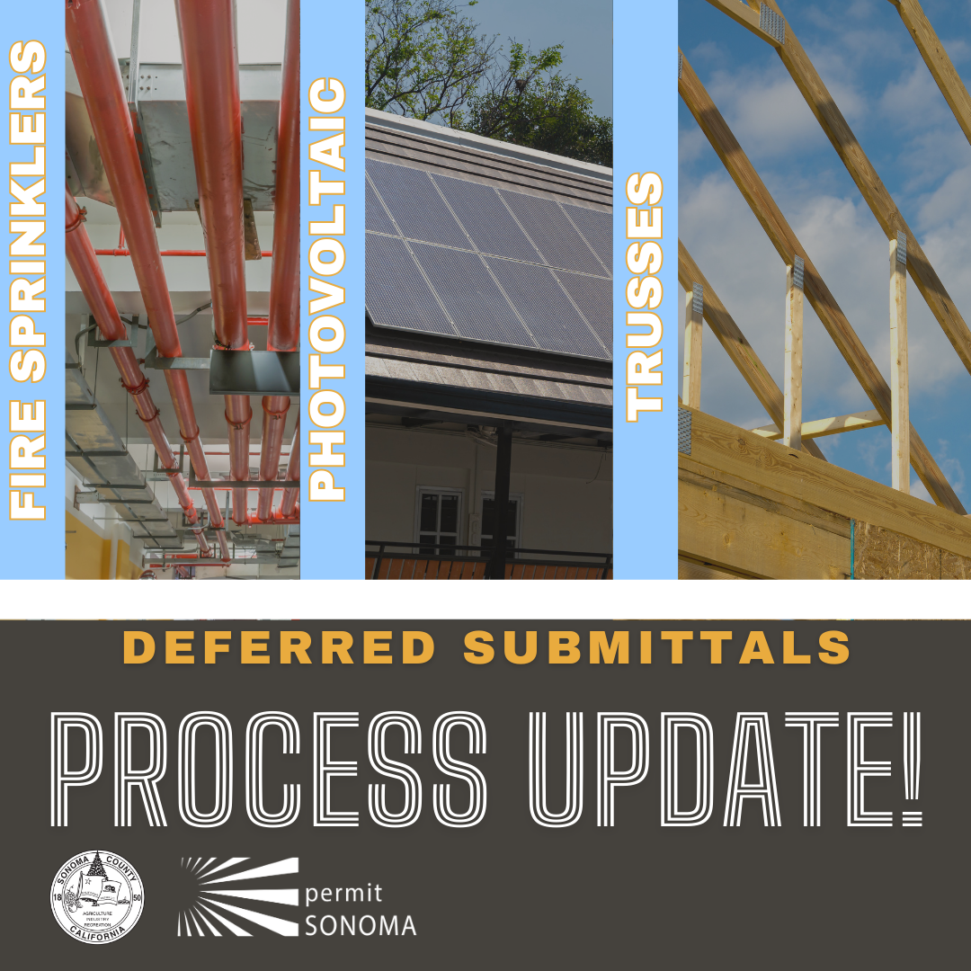 Permit Sonoma is implementing new submittal requirements for building permits that will go into effect on October 1, 2024. The new process will no longer allow deferred submittals for trusses, photovoltaic systems, and fire sprinklers. These items must be submitted along with the customer's building permit application or prior to the issuance of the building permit.