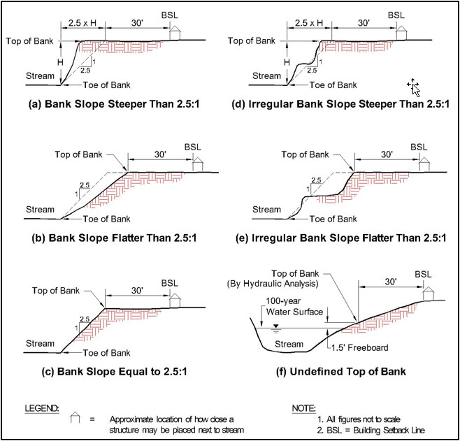 All structures requiring a building permit or an agricultural exemption shall be set back from streams, as measured from the toe of the stream bank outward, a distance of 2.5 times the height of the stream bank plus 30 feet or 30 feet outward from the top of the stream bank, whichever distance is greater, unless a greater distance is established in the General Plan, Local Coastal Plan, and/or Zoning Code. If the top of the stream bank cannot be determined by visual analysis, it shall be determined by hydraulic analysis as the water surface elevation for the 100-year storm event plus 1.5 feet. Stream bank height is the change in elevation from the top of bank and the lowest toe of bank. See Figure 1 for graphical examples of stream setbacks for structures. For questions regarding stream setback requirements for structures, please visit or call Permit Sonoma’s Building Plan Check customer service cubicle at (707) 565-2095. -